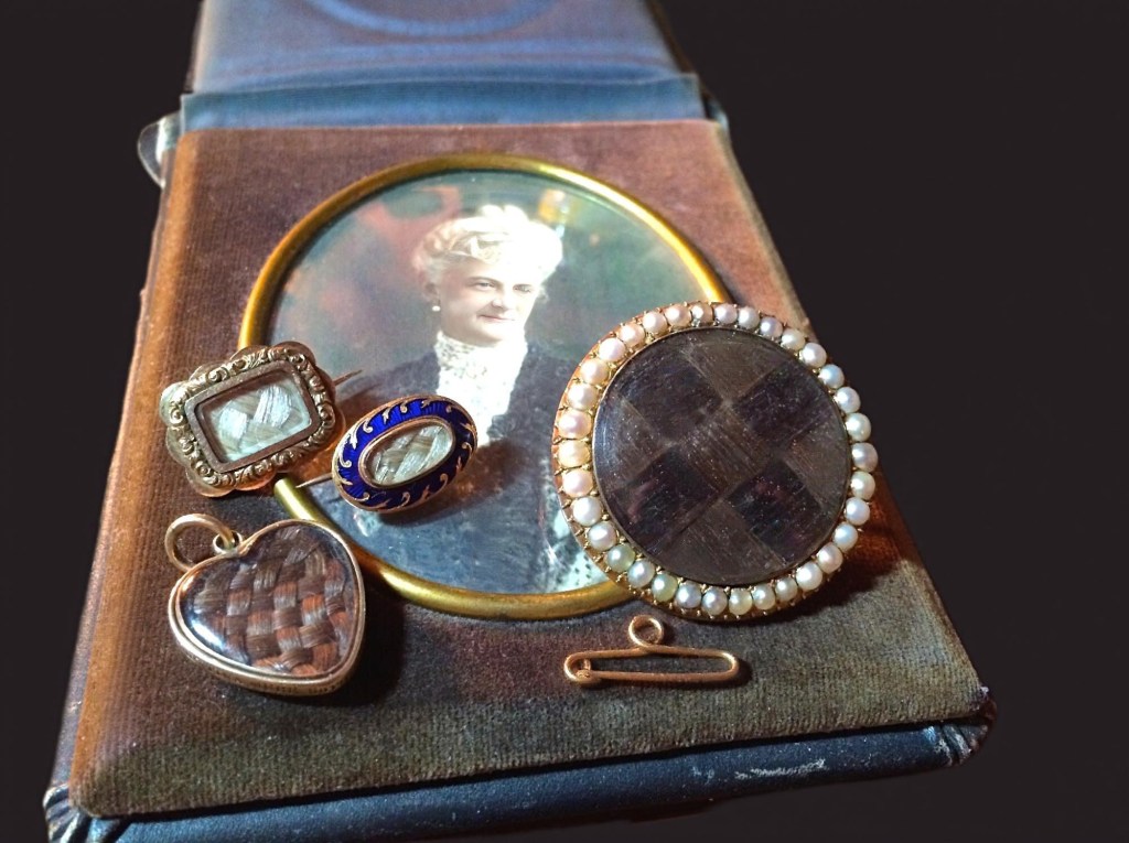 The small blue enamel brooch holds the hair of Englishman Joshua Brooks, who dined at Mt. Vernon with George and Martha Washington, and the fourth, heart-shaped, is Scottish and holds the hair of Helen Clementina Duff Muir. Her sister was Lord Byron’s childhood sweetheart, Mary Duff Coe.