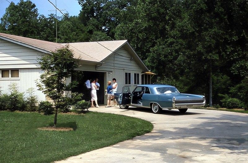 37. Tough negotiations underway in the drive of this suburban home, 1960s.