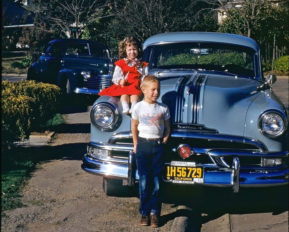 22. Brother, sister, and mechanical siblings (a 1953 Pontiac and older brother, a 1941 Pontiac) in Lakespur, California. Courtesy Shorpy.