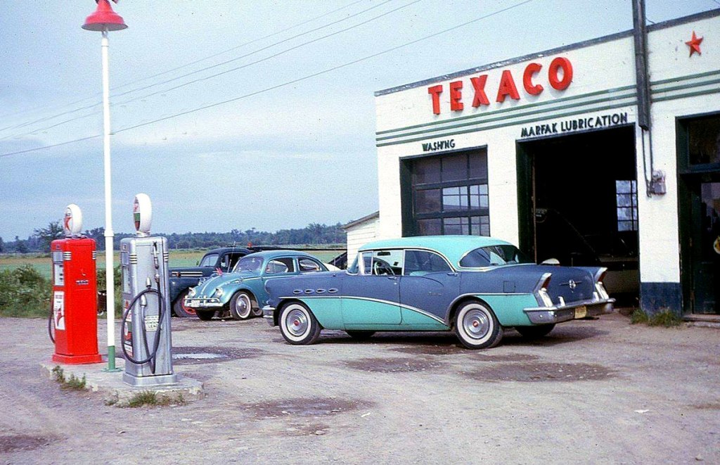 9. This rather odd two-tone Buick and a sugary-blue Volkswagon parked at an Ottawa, Ontario Texaco, 1962.