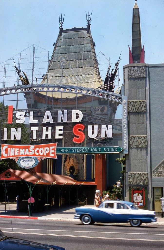 5. A blue car speeds past Grauman’s Chinese Theatre, Los Angeles, 1957. The movie “Island in the Sun” was a spicy tale of interracial romance.