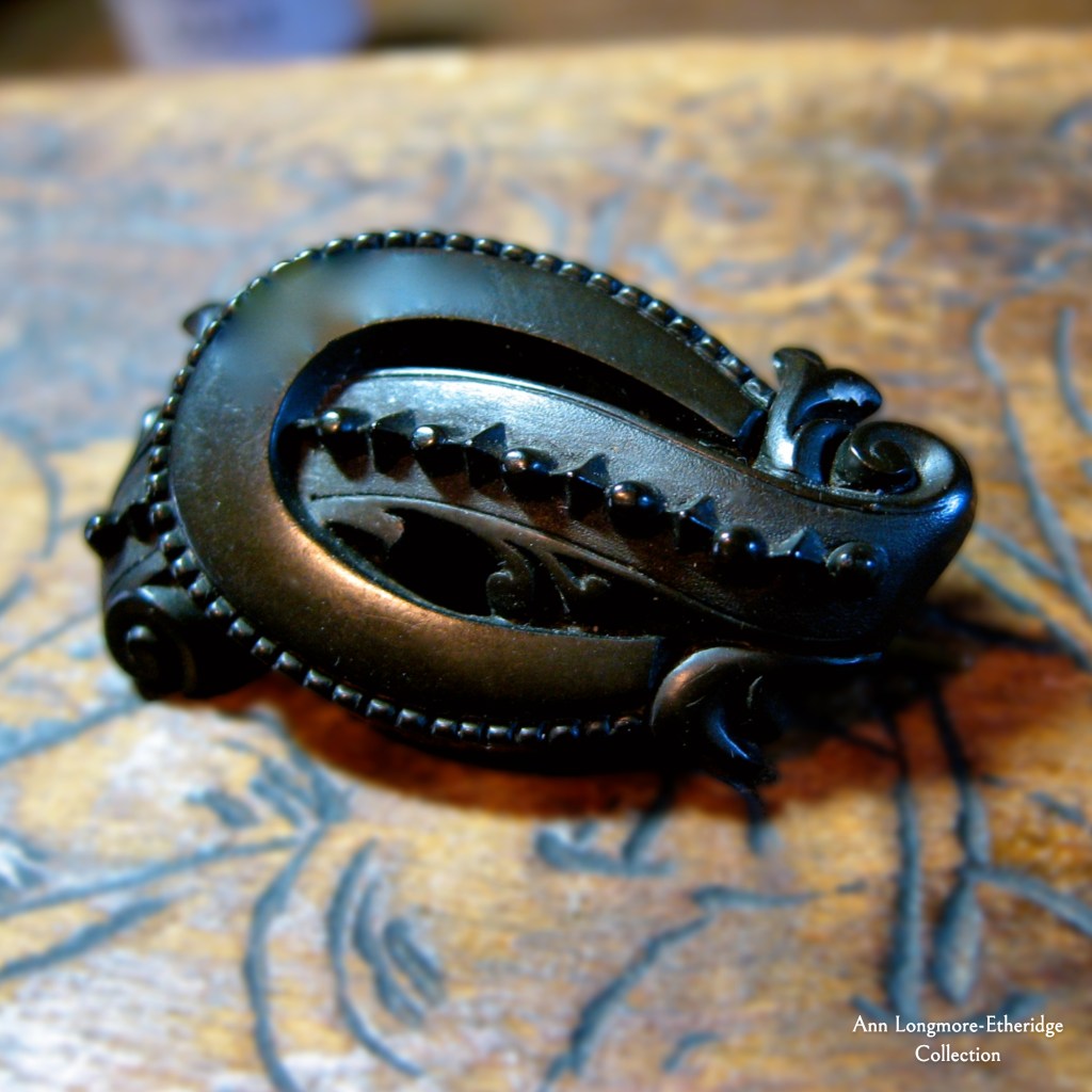 Swirling vines and dots gutta-percha mourning brooch, late 1800s.