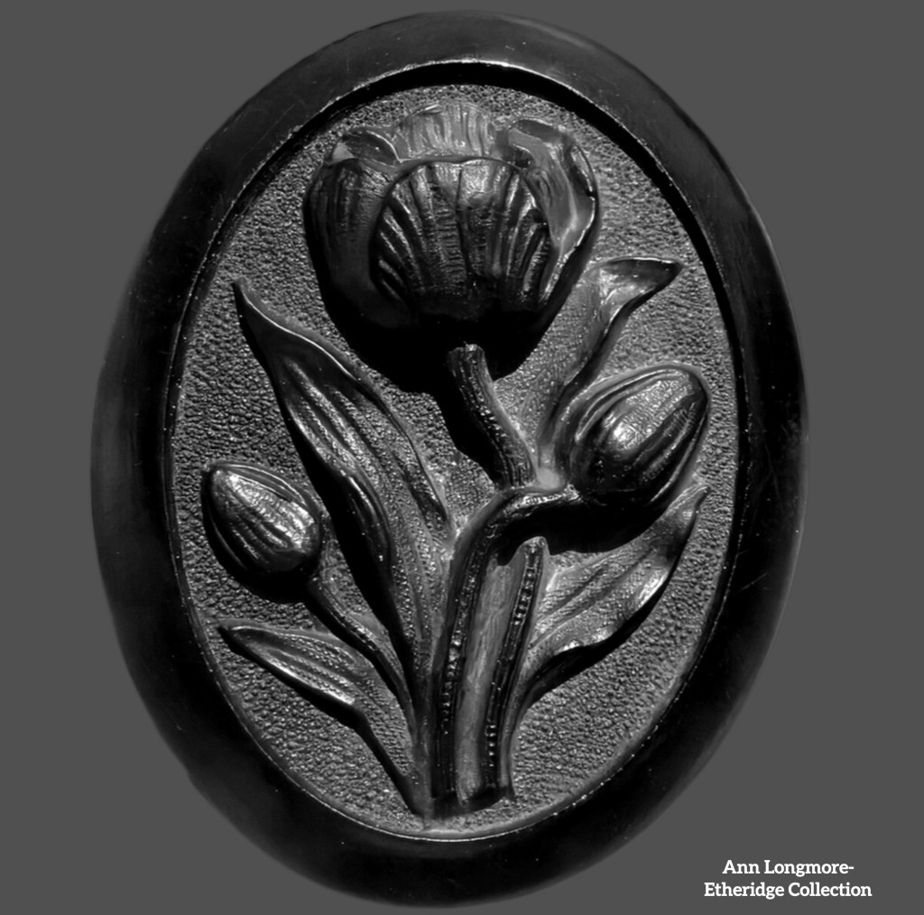 Gutta-percha tulip mourning brooch, circa 1885.