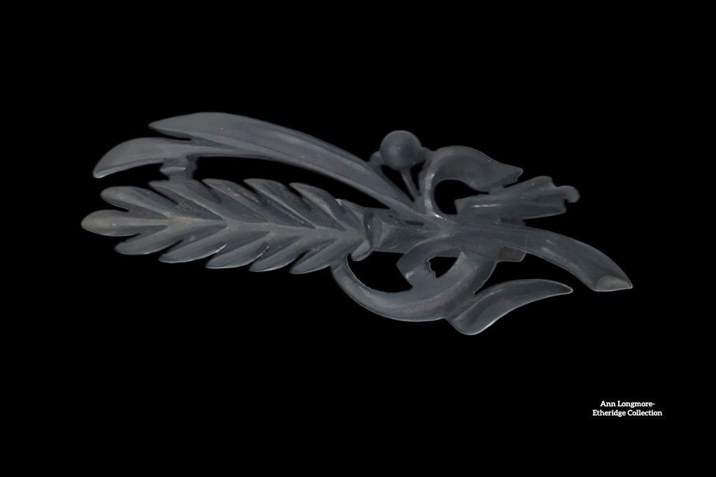 Gutta-percha found a prominent place in jewelry, particularly mourning jewelry. The Victorian fascination with mourning—especially after the death of Great Britain’s Prince Albert in 1861—created a demand for somber yet elegant adornments. It was molded into brooches, lockets, and bracelets, often featuring intricate floral or Gothic-inspired designs. Gutta-percha’s dark, matte finish made it an ideal material for mourning jewelry, as it symbolized grief and modesty whilst being affordable compared to traditional materials like jet. Such pieces could also be purchased, premade and reasonably priced, at local mercantiles—unlike gold jewelry containing a lock of the deceased’s hair, which took time to produce by a jeweler. The gutta-percha pieces, therefore, were available for wear at funerals held a few days after death. The lightweight nature of gutta-percha and its ability to be carved into fine detail further solidified its status as a popular choice for commemorative and mourning pieces.